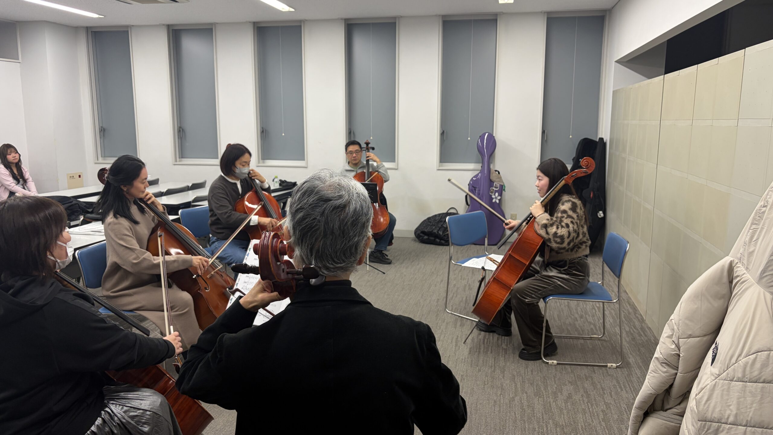 いえいえ、そう考えるのは早計に過ぎます。今シーズン、講師陣で一番張り切っているのが最年長のチェロの毛利先生です。毎回、にこやかな表情でトップの席に陣取り、時にマエストロの発言を遮るくらいの勢いで積極的にアドバイスを送ってくださいます。以前より少し人数が少なくなってしまったチェロパートですが、そんな毛利先生を中心に結束を固め合っている様子です。