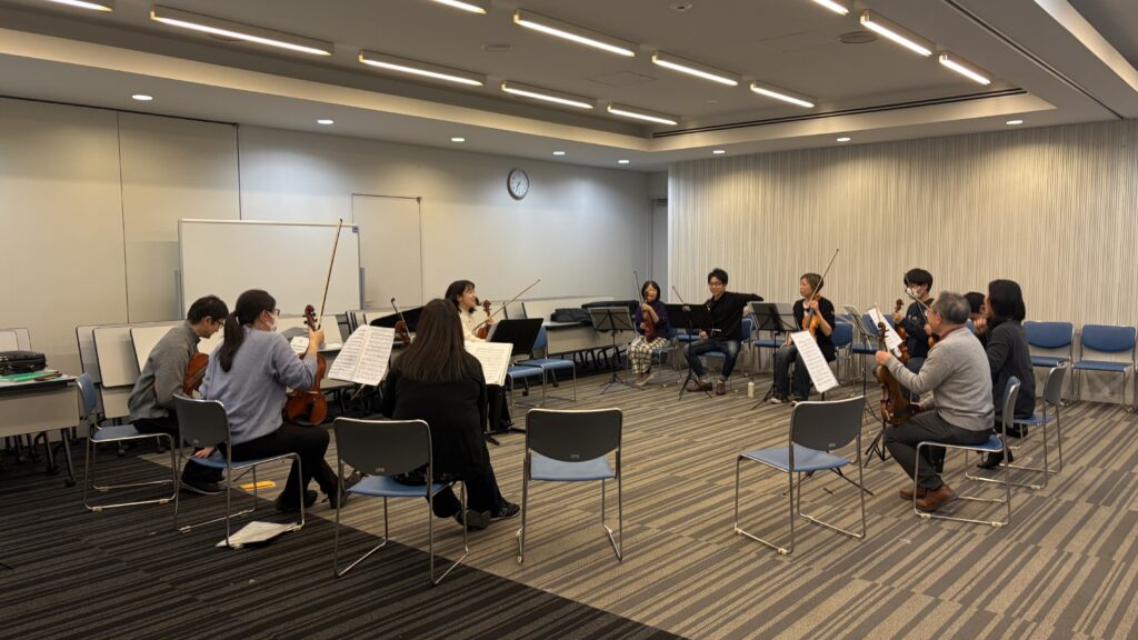 団員たちの熱心さはリハーサルルームだけではありません。リハーサル前の時間に、ヴァイオリンの某団員の呼びかけで以前から別室で細々と自主練を行っていたのですが、今シーズンに入ってから自主練参加者がうなぎ上り。テクニックが難しいところをゆっくり練習したり、音程やボウイングを確認したり、弾きやすいフィンガリングを教えあったりしながら、有意義な時間を共有しています。